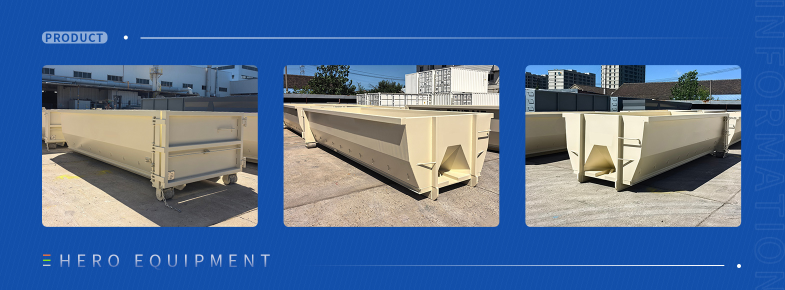 Hero Equipment (Yangzhou) Co., Ltd is een joint venture en gespecialiseerd in de productie en verkoop van verschillende speciale containers. De belangrijkste producten omvatten verschillende stalen bakken / containers (skipbakken, hookliftbakken, enz.) Voor het afvalrecyclingveld, apparatuurcontainers (mobiele generatorcontainers, silo -containers, watercontainers, enz.), Speciale doeleinden (huiscontainers, korrelcontainers, d.g. containers, enz.), En dus. 15 miljoen momenteel, met een oppervlakte van 25.000 vierkante meter volledig. Het hoofdworkshopgebied is 10.000 vierkante meter, en het gebied van magazijn, stapelwerf en andere angstaanjagende voorzieningen bedroeg in totaal bijna 10.000 vierkante meter.